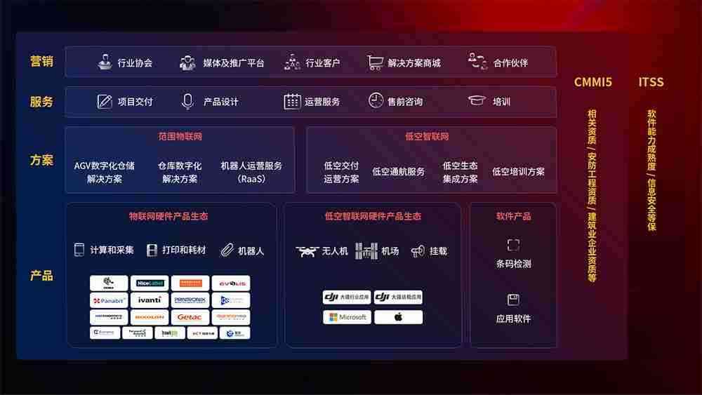 聚合国内外先进的物联网硬件产品品牌,,,,聚焦数字化仓储、、机器人运营、、、低空智联网等领域,,共同打造适合客户业务场景的解决方案并提供交付服务